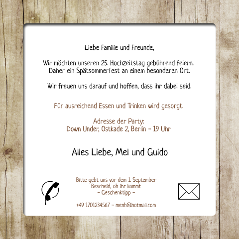 Wenn sie diese meldung sehen heisst das dass javascript in ihrem browser deaktiviert ist aktivieren sie javascript bitte damit diese anwendung richtig funktioniert. Auf der vorderseite bietet sich demzufolge das hochzeitsfoto des ehepaares an. Hochzeitstag die einladung. Denn schliesslich zeugt eine solange ehezeit.