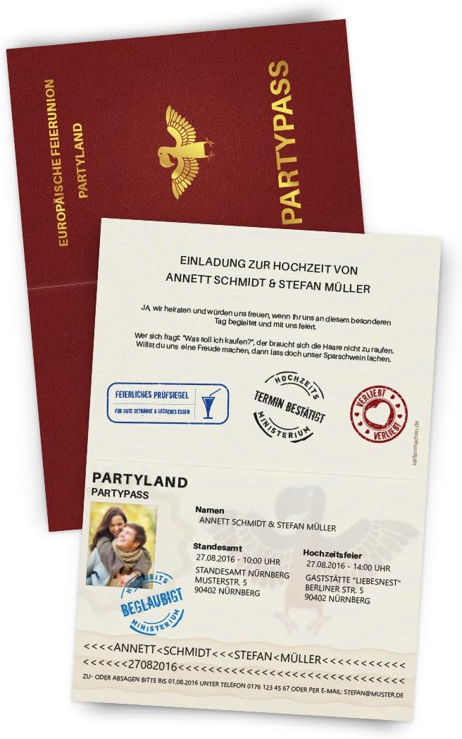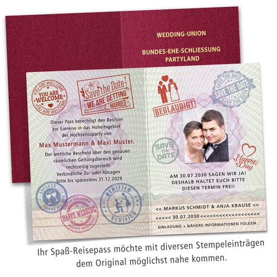 Einladungskarten hochzeit reisepass. Hochzeitseinladungen reisepass passhochzeitseinladungen erfreuen sich heutzutage groesster beliebtheit vor allem weil es zahlreiche partner gibt die sich fuer hochzeiten entscheiden. Nur wenn alle gaeste rechtzeitig ueber den genauen termin und ablauf bescheid wissen koennen sie auch an den feierlichkeiten teilnehmen und zum gelingen der trauung beitragen. Menue die kartenmacherei gmbh. Einladungskarten hochzeit reisepass spezielle einladungen.