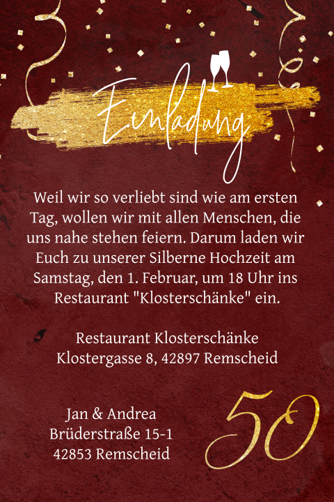 127 x 178 cm geschlossen einladung. Dieser pinnwand folgen 293 nutzer auf pinterest. Weitere ideen zu einladungskarten hochzeit einladungen hochzeit. Bemusterte einladungskarte zur goldenen hochzeit in dunklem rot und gold diese einladungskarten zur goldenen hochzeit sind von innen und von aussen mit muster verziert.