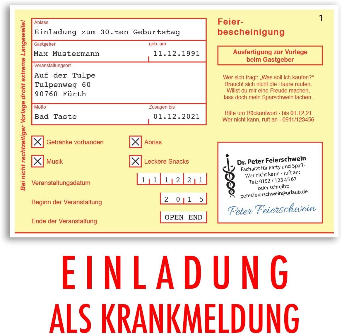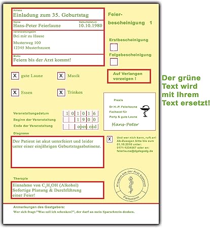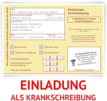 0800 260 1000 oder serviceatwunderkartende. Einladungskarten geburtstag krankschreibung krankmeldung krankenschein 30 stueck einladung geburtstagseinladung als lustige einladungen. Geburtstag party einladung einladung ideen krankenschein geburtstag mann lustig. Geburtstag 60 geburtstag ideen einladung 50.