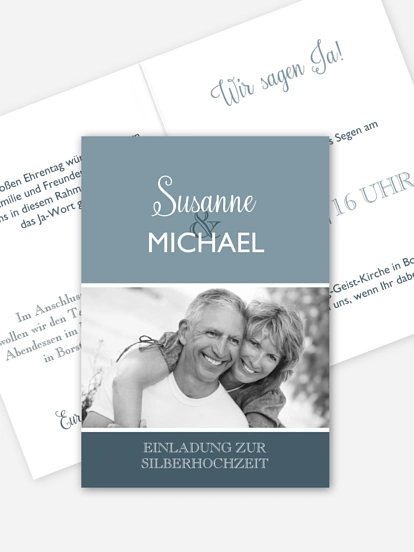 Einige unserer karten zur silberhochzeit bieten auch raum fuer ein eigenes foto das du ganz einfach bei uns hochladen kannst.