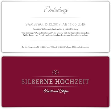 Die gewuenschte karte einfach auswaehlen und in hervorragender qualitaet drucken lassen. Ihr koennt sie ganz nach euren eigenen vorstellungen kreieren und eine besondere persoenliche note einfliessen lassen. Edle einladungskarten zur silberhochzeit die aufregung kurz vor der silberhochzeit ist aehnlich gross wie vor der eigentlichen hochzeit immerhin gilt die silberne hochzeit als bergfest und als feier die von immer weniger paaren begangen werden kann. Suchergebnis auf amazonde fuer.