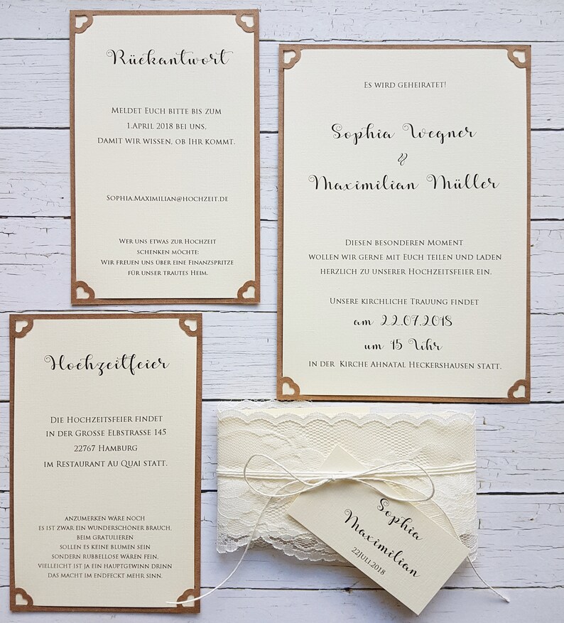 We would like to show you a description here but the site wont allow us. 25042016 einladung hochzeitseinladung hochzeit karte kraftpapier vintage rustikal spitze band paketschnur jutestoff juteband knopf weiss braun. Teilt in eurer hochzeitseinladung auch mit wann die standesamtliche hochzeit stattfinden wird damit gaeste die ausschliesslich zur kirchlichenfreien trauung geladen werden ueber diesen termin informiert werden und selbst entscheiden koennen ob sie euch an diesem tag vor dem standesamt ueberraschen. 12032019 erkunde deborah muellers pinnwand selbstgemachte einladungen auf pinterest.