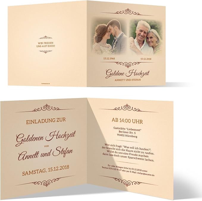 Schoene einladungskarten zur goldenen hochzeit. Je groesser das fest werden soll desto wichtiger ist es natuerlich die einladungskarten zur goldenen hochzeit rechtzeitig zu gestalten. Innerhalb kurzer zeit hast du schoene und trotzdem guenstige einladungskarten in deinen haenden. Wer eine rede zur goldenen hochzeit halten moechte hat auf unserer seite die moeglichkeit sich eine passende vorlage auszusuchen und diese direkt fuer seine rede zu verwenden oder aber noch zu personalisieren. 26062018 wunderbare einladungstexte fuer die einladung zur goldenen hochzeit sowie ausgewaehlte sprueche und zitate.