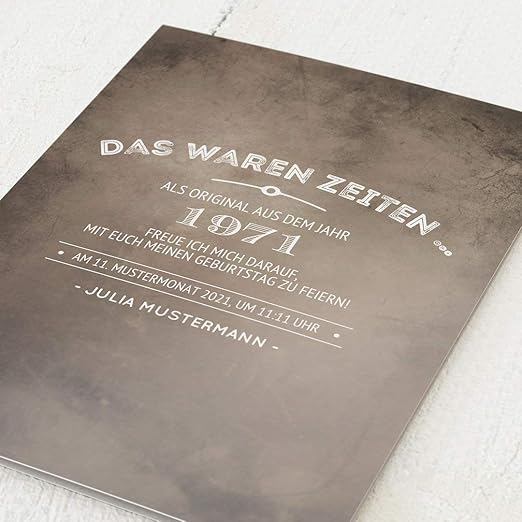 Ich war sehr zufrieden mit den einladungskarten auch mit der schnellen lieferung und guten verpackung. Ein halbes jahrhundert klingt beeindruckend. Bedruckte umschlaege passend zu den einladungskarten hochwertige papierauswahl. Einladungskarten 50 geburtstag text lebenserfahrungen fuer fuenfzig jahre sind eine menge und fuer jemanden der dieses alter erreicht sollte er oder sie feiern und sich freuen.