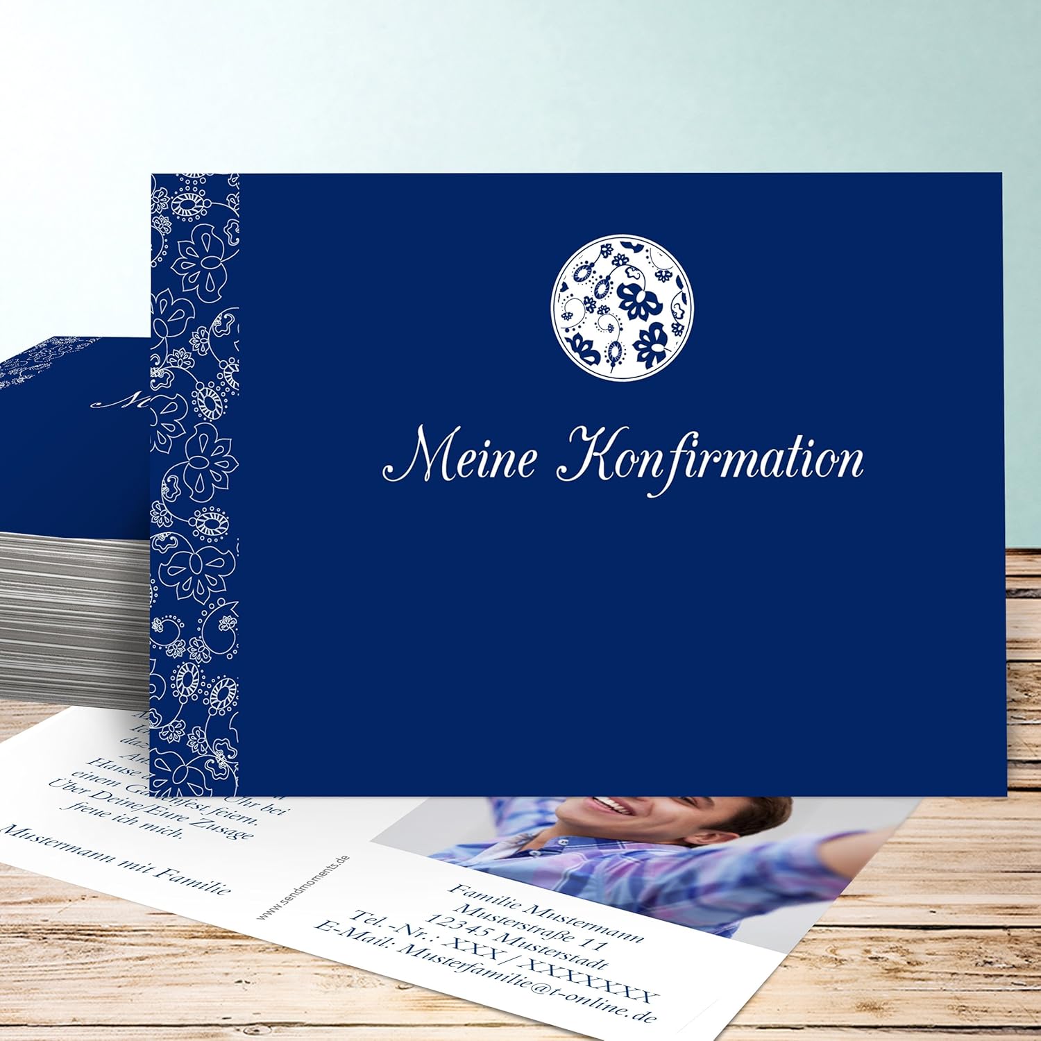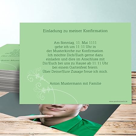 Die qualitaet des produktes ist sehr gut. Einladungskarten sind sehr schoenalles hat sehr gut geklappt dafuer in allen bereichen 5 sterne. Und das endergebnis der konfirmationseinladung meines sohnes ist jeden cent wert. Wir werden sicher auch die dankeskarten bei sendmoments machen lassen.