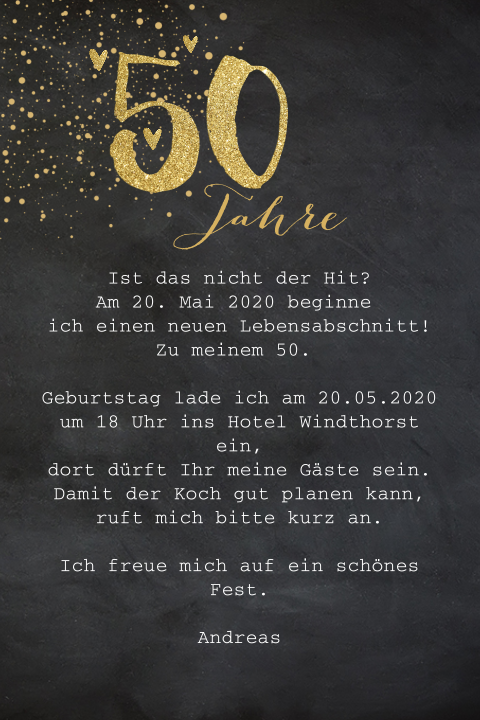 Text fuer die einladungskarte es ist ja nicht so ausgemacht dass es ab 50 nicht mehr kracht das will ich gerne demonstrieren ein fest dazu organisieren mich da in hochform praesentieren ihr duerft mir dann auch gratulieren autor. Einladungskarten 50 geburtstag text lebenserfahrungen fuer fuenfzig jahre sind eine menge und fuer jemanden der dieses alter erreicht sollte er oder sie feiern und sich freuen. Hoffentlich helfen ihnen die einladungssprueche zum 50. Anlaesslich der feier eines besonderen antiquariats naemlich mich und meine goldene 50 lade ich euch zu einem entsprechenden besonderen antiquitaetenmarkt ein.